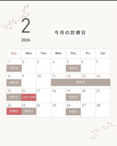 お知らせ2026.02.01 2月の診療日について【2月の診療について】 特別日曜診療日・2月22日(日) 臨時休診日・2月13日(金)、14日(土)・2月16日(月)は14時から診療開始 詳しくは診療カレンダーをご確認ください。 休診中のご予約・お問い合わせは当院ホームページのネット予約またはお問い合わせフォームをご利用ください。ご不便をおかけしますが、ご理解の程よろしくお願いいたします。